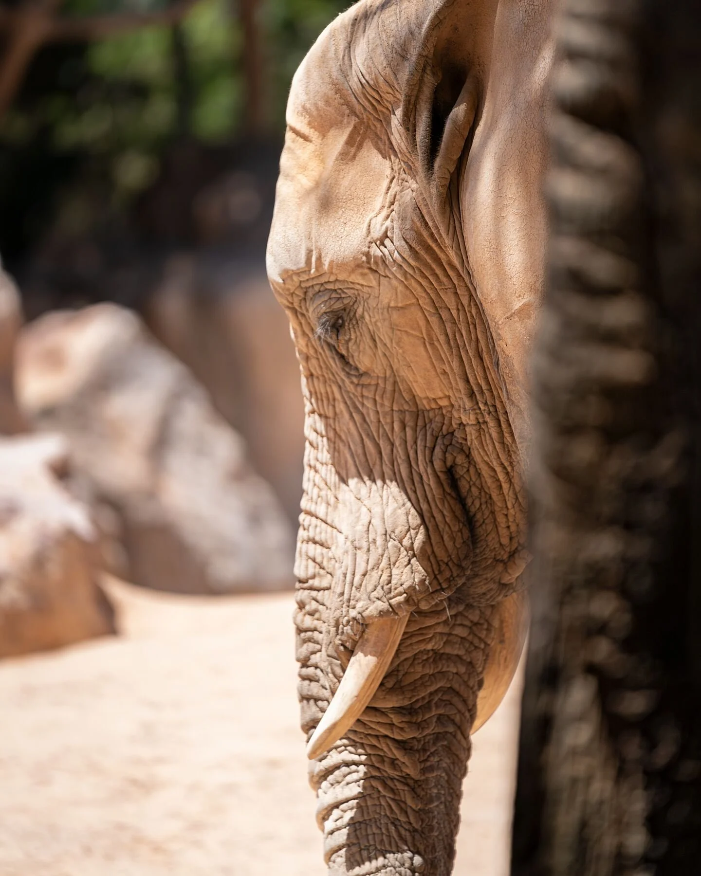 The grandeur of a gentle giant at the Bioparc in Valencia, Spain—a fenceless zoo dedicated to conservation and wildlife education. Elephants are magnificent creatures capable of displaying a range of emotions, including joy, grief, and compassion.